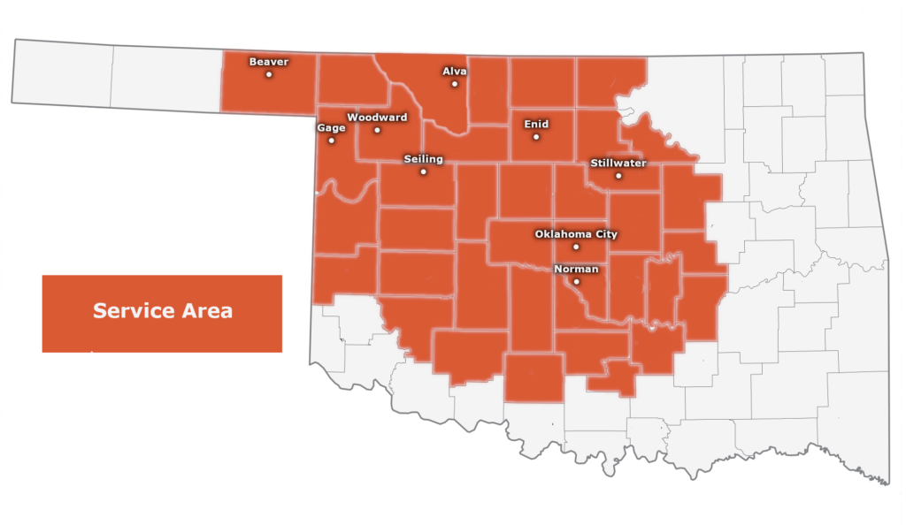 Oklahoma City, Yukon, Mustang, El Reno, Norman, Moore, Edmond, Guthrie, Shawnee, Stillwater, Enid, Weatherford, Clinton, Kingfisher, Purcell, Pauls Valley, Watonga, Woodward, Alva, and surrounding rural areas.